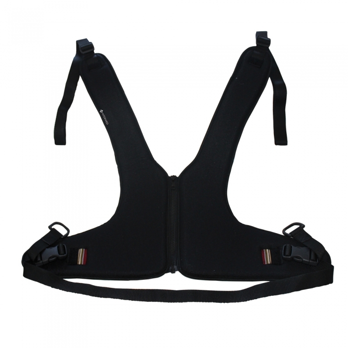 Support made of coupled velvet with breathable mesh inner part, padded with expanded polyurethane and adjustable straps made of polyester tape, equipped with rings.