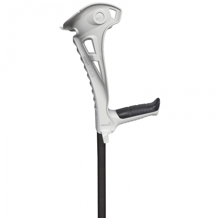Height-adjustable crutches with enveloping forearm support and ergonomic handle. The aluminum structure is continuous along the entire length of the device and the tubes are not extruded but are made with welded aluminum sheets. The unique conformation of the rubber tips allows a perfect adherence to the ground even in case of inclination of the crutches. Height adjustment from 70,5 to 99.5 cm.