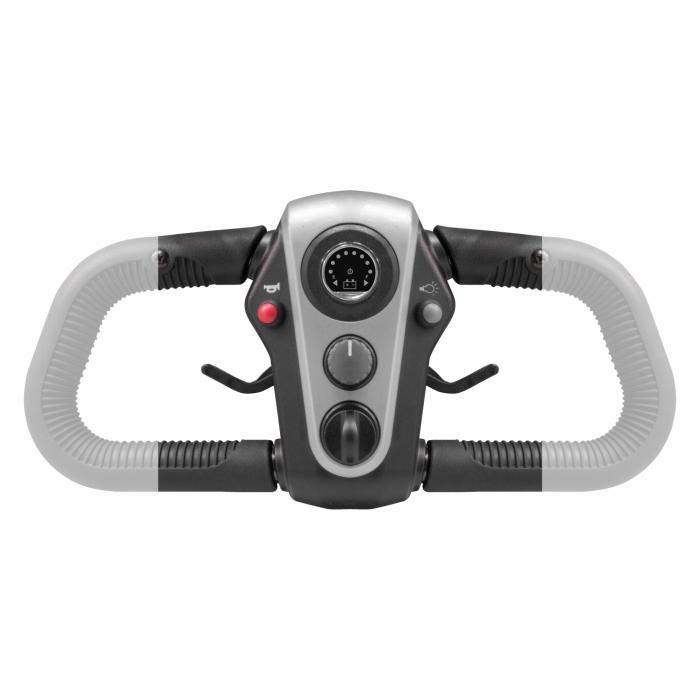 On the console: ignition key switch, front light button, horn, and speed regulator.