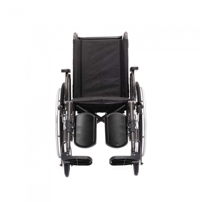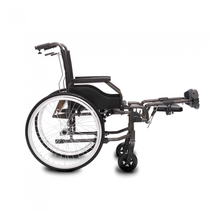 Folding aluminum wheelchair with adjustable reclining backrest with rack and stabilizer bar. Folding armrests, elevating legrests, with adjustable calfrests in depth. Lever parking brakes for the 24” quick-release full PU rear wheels, 6” full PU front wheels.