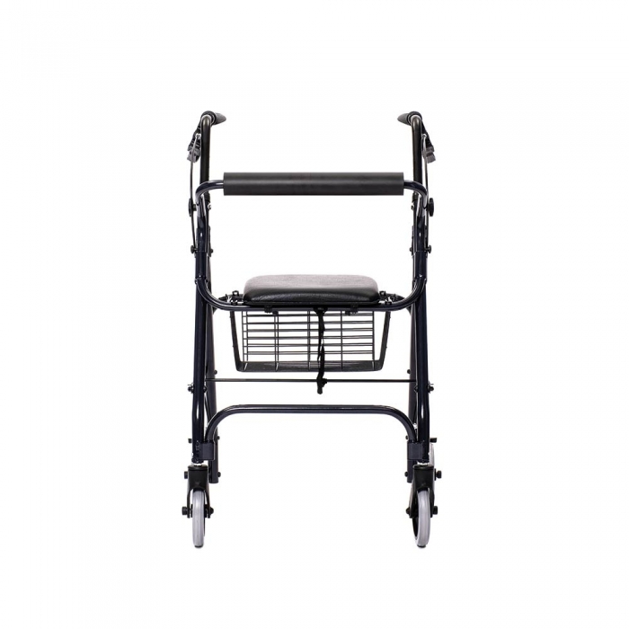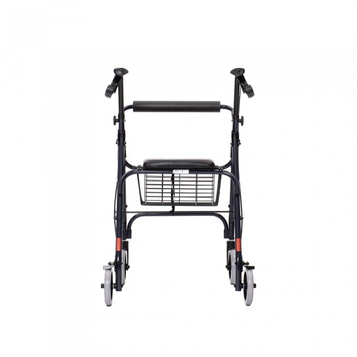 Foldable aluminum rollator with four wheels, swiveling front wheels and fixed rear wheels with parking brake, equipped with the following basic configuration:
