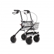 Foldable aluminum rollator with four wheels, two swiveling front wheels and two fixed rear wheels with braking system, equipped with the following basic configuration: