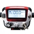 Digital display shows battery charge level, speed indicator, operating time, and distance traveled during operation.
