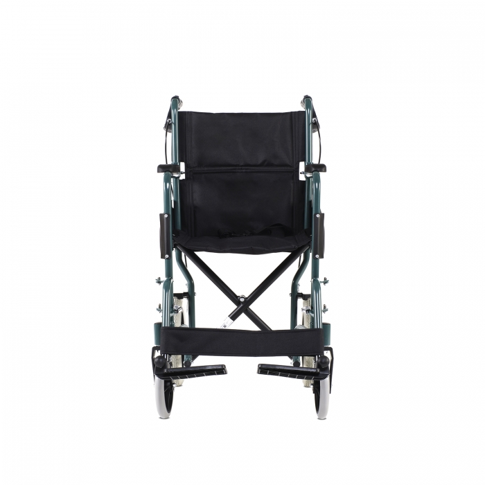 Foldable aluminum wheelchair with 12” solid PU rear wheels. Fixed armrests, removable and height-adjustable footrests, cable brakes on the rear wheels operated by the caregiver through levers on the push handles. The seat is made of durable padded nylon with a back pocket and a safety belt. Available in green.