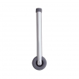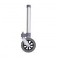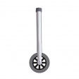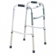 Folding walker with aluminum frame, two horizontal steel stabilizing bars, and four ground contact points. The opening and closing of the two side sections of the frame are easily done by the locking pin located at the center of the upper bar. Two rubber handles ensure a proper and secure grip on the frame. Height adjustment is possible. The four legs are equipped with non-slip rubber tips that provide a stable support base during use. The walker can be equipped with optional components such as fixed or swivel wheels with a diameter of 3" or 5" and a locking system.