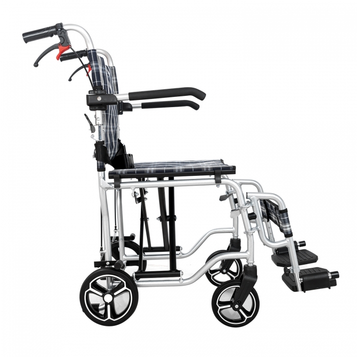 Foldable aluminum transport chair with wheel locks and brakes for the caregiver on the handles.