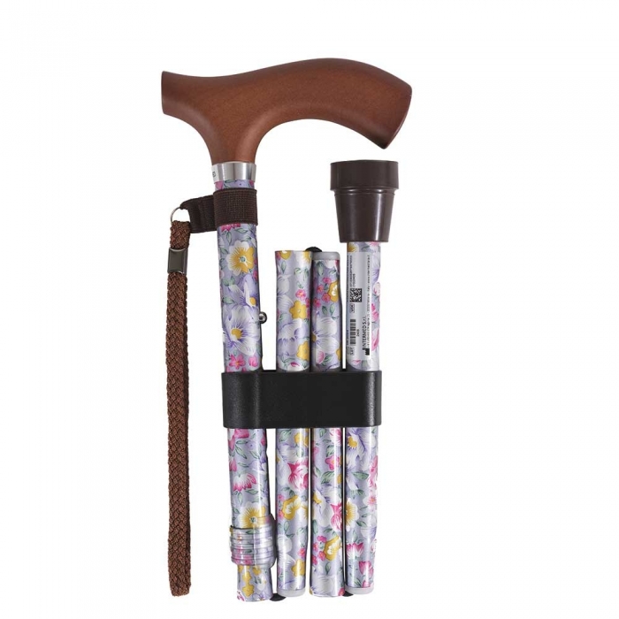 Bastone in alluminio regolabile in altezza, colore fantasia a fiori con manico in legno Marrone, disponibile nella versione tubo intero o pieghevole. Puntale in gomma Marrone.