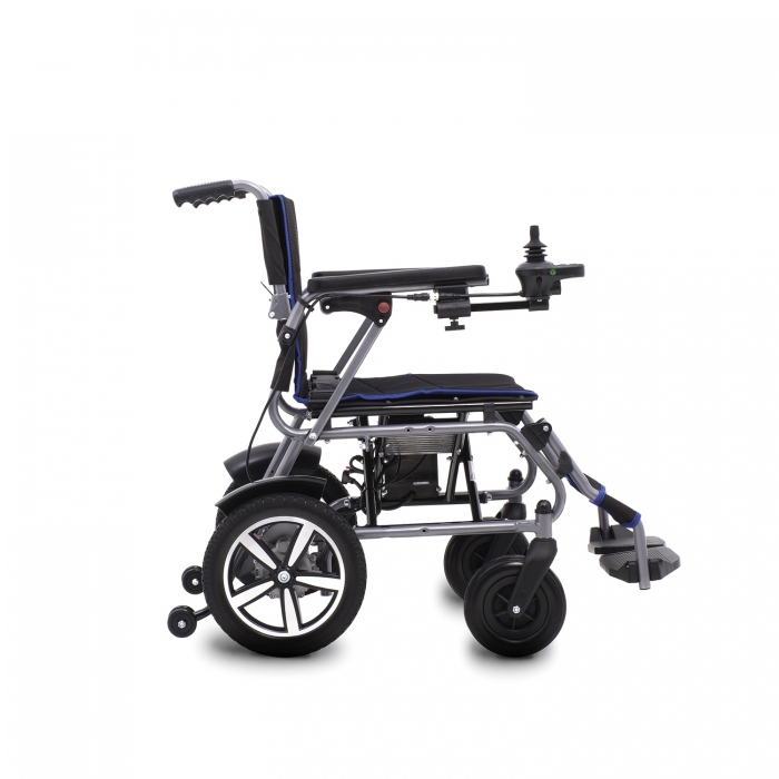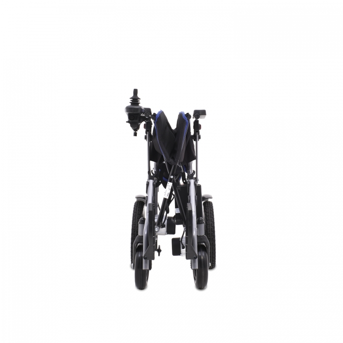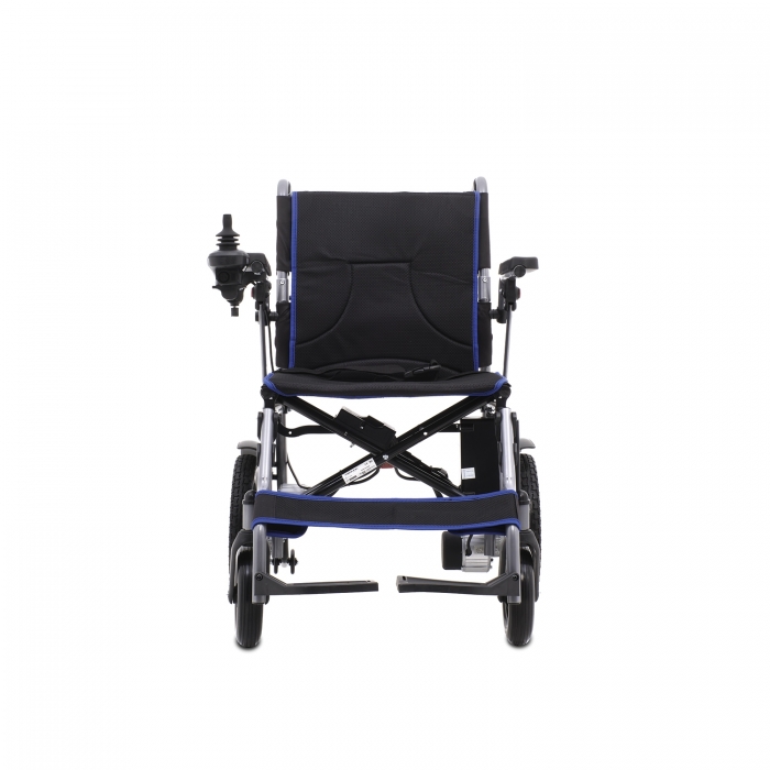 Carrozzina elettrica con telaio in acciaio a doppia crociera pieghevole.