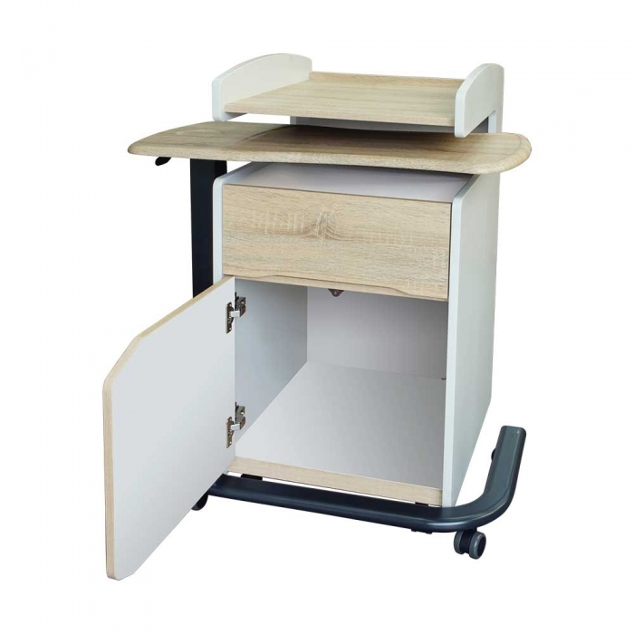 Comodino laterale al letto, configurato con due ripiani, un cassetto ed un armadietto, dotato di 4 ruote piroettanti di cui 2 con freno. Il comodino è predisposto per integrare il vassoio servi-letto, se non in uso, evitando un ingombro superfluo attorno al letto.
