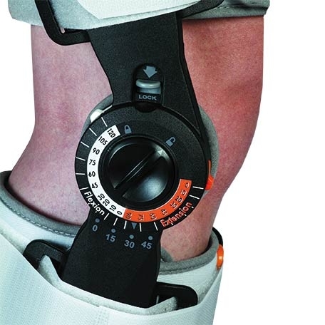 Ginocchiera post operatoria con articolazione graduata (R.O.M), regolazione della flessione da 0° a 120° e dell’estensione da 0° a 90°.Aste laterali regolabili in lunghezza chiusura con cinghie a velcro.