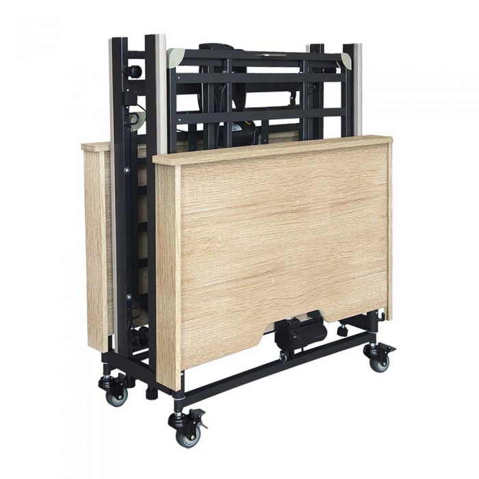 Sezione piedi con regolazione manuale a cremagliera. Sezione bacino fissa. Altezza variabile del piano rete compresa tra circa 21 cm di altezza minima e 59 cm di altezza massima, regolabile mediante due attuatori elettrici 24 V DC inseriti internamente ai pannelli delle spalliere del letto che permettono inoltre, tramite regolazione separata con comando a filo, la posizione di Trendelenburg fino a 11° e anti-Trendelenburg fino a 11°.