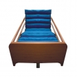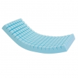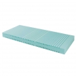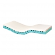 - una superficie d’appoggio in schiuma viscoelastica espansa divisa in tre parti: a) zona testa, superficie liscia, in densità 21 kg/m3 b) zona tronco-bacino, a punta di piramide tronca, in densità 50 kg/m3 resilienza 5 c) zona piedi lavorata a punta di piramide tronca in densità 50 kg/m3 resilienza 2.