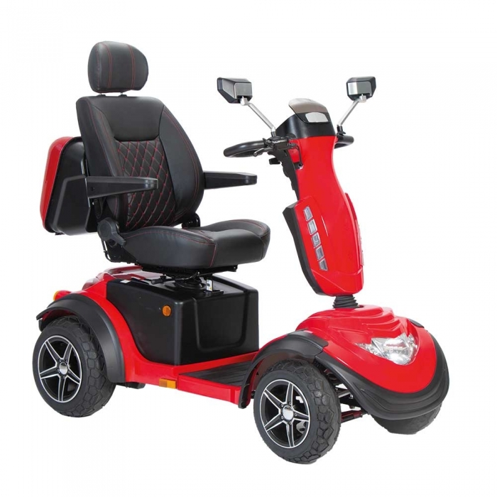 Lo schienale è reclinabile ed i braccioli sono ribaltabili e regolabili. Sulla consolle del manubrio sono posizionati, un display a cristalli liquidi dove visionare i vari parametri attivi dello scooter (es. velocità, carica batteria, ecc.) e i pulsanti che permettono di controllare le diverse funzionalità dello scooter. La dotazione comprende: frecce direzionali anteriori e posteriori, una presa per ricaricare le batterie e un caricabatterie, un freno meccanico di stazionamento, due specchietti retrovisori, un baule porta-oggetti posteriore, fari anteriori e luci posteriori. Le due batterie da 100 Ah cad. offrono una potenza di 1400W (con un picco di massima potenza di 2400W) e permettono un’autonomia di 70 km*, con una velocità massima impostabile di 18 km/h.