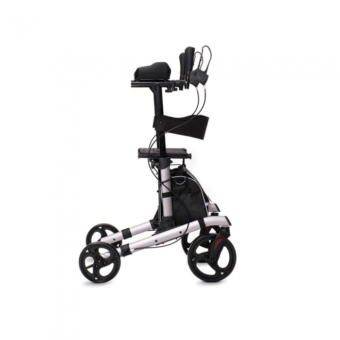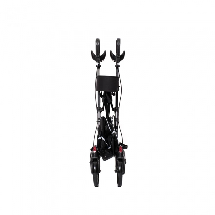 Deambulatore con ruote e struttura pieghevole in alluminio. Ruote anteriori piroettanti. Ruote posteriori fisse dotate di freni. Dotato in configurazione base: