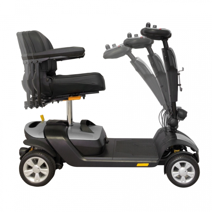 Scooter elettrico con telaio smontabile in quattro parti (blocco motore, blocco batterie, scocca/piantone e sedile) che garantisce comoda possibilità di trasporto.