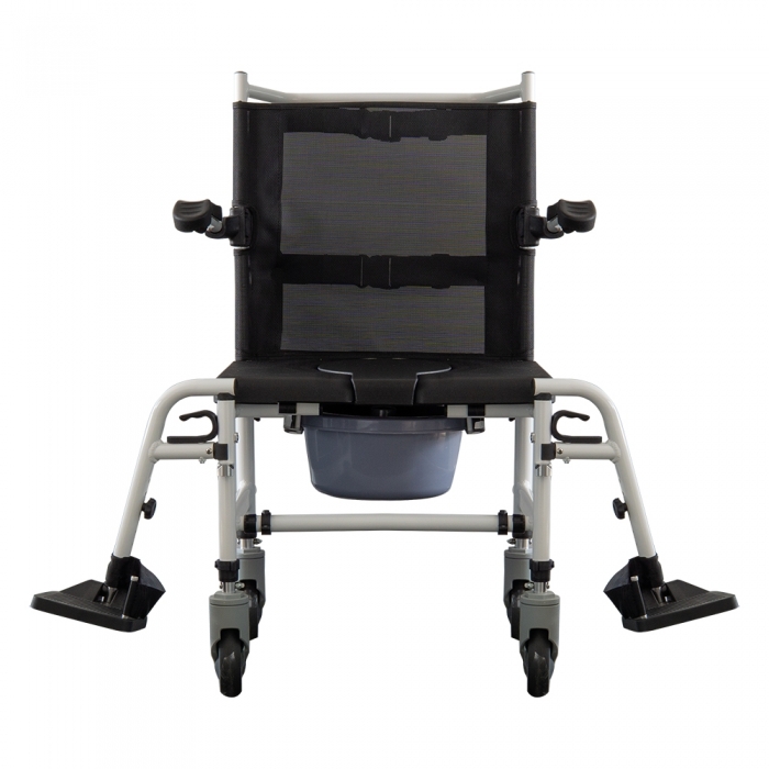 Sedia da doccia e da comodo con struttura in alluminio e ruote da 5” dotate di freni di stazionamento. Due livelli di regolazione in altezza. Schienale e seduta in poliuretano morbido idrorepellente o tela imbottita per le misure più grandi. Seduta con foro anteriore ad U apribile. Braccioli ribaltabili con poggia-braccio morbido. Dispositivo wc estraibile. Pedane estraibili e ribaltabili.