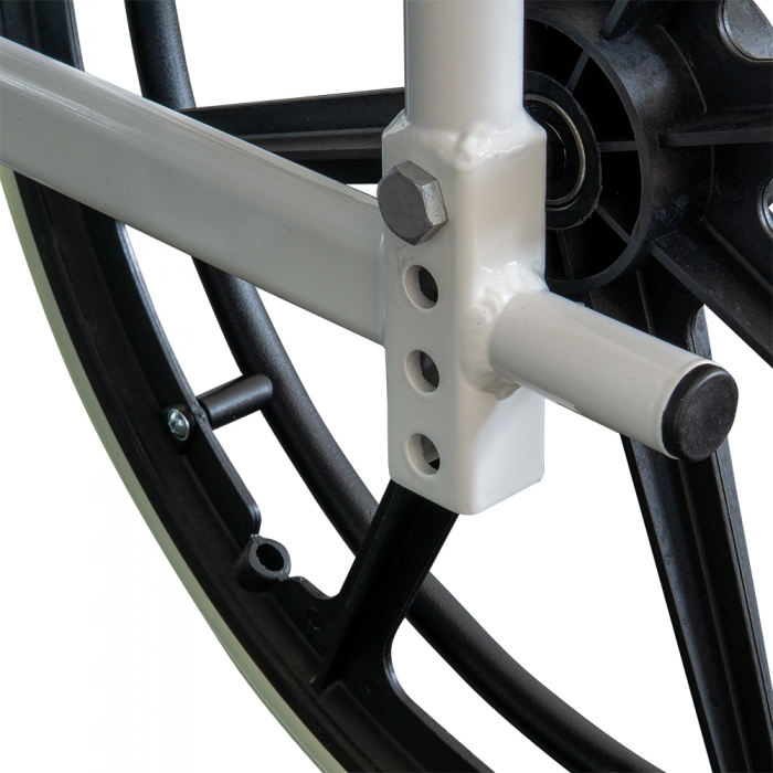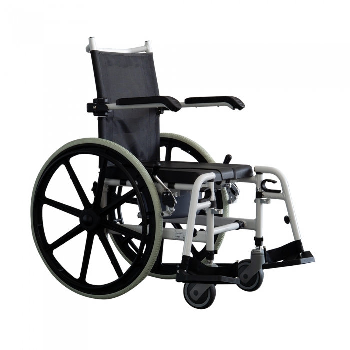 Sedia da doccia e da comodo con struttura in alluminio e ruote posteriori da 24” dotate di freni di stazionamento.