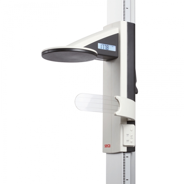 La stazione di misura wireless 360° seca 285 rileva il peso e l'altezza contemporaneamente. É provvista di una bilancia pesa persone di alta portata, 300 kg, e di un altimetro ad asticella con integrata la Linea di Frankfurt, per la corretta postura della testa.