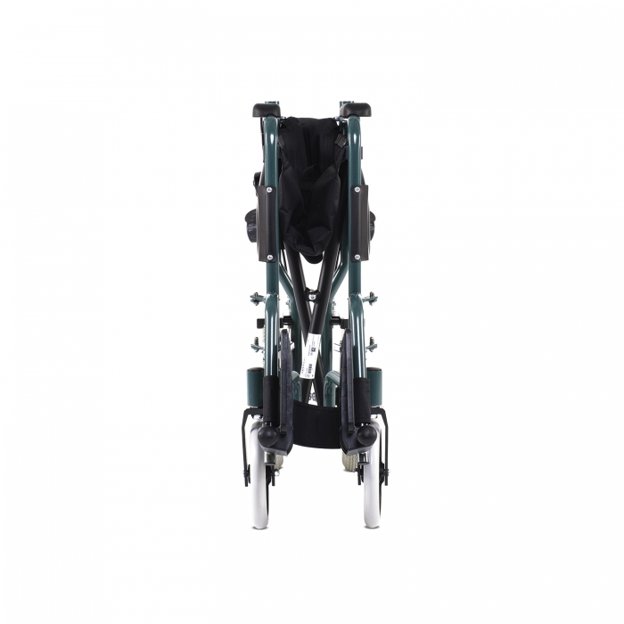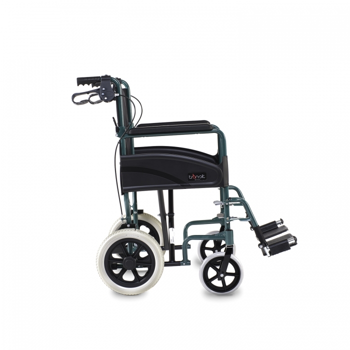 Carrozzina con telaio pieghevole in alluminio, ruote posteriori da 12“con copertone in PU pieno. Braccioli fissi, pedane estraibili e regolabili in altezza, freni a cavo sulle ruote posteriori azionabili dall’accompagnatore mediante leve sulle maniglie di spinta.